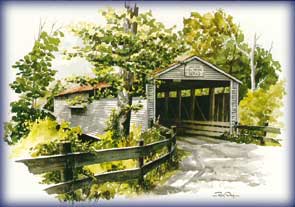 The Huffman Mills Bridge is the subject for AN OLD COVERED BRIDGE. The 140-foot span crosses the Anderson River between Perry and Spencer counties in southern Indiana. Built by W. T. Washer in 1863 the bridge features a single Burr arch truss—a spanning devise developed and patented by Theodore Burr in 1804.