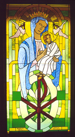 rests atop a Chi-rho, the Christian symbol of Christ.